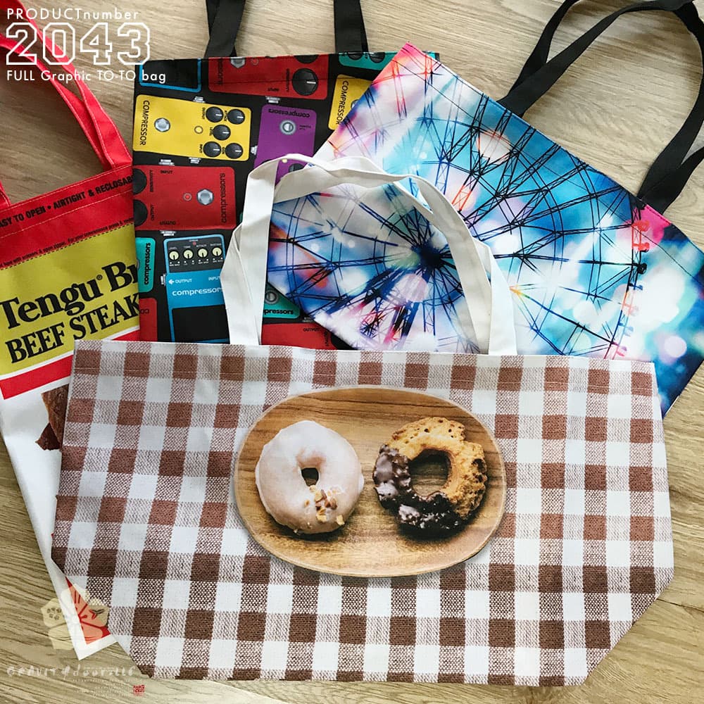 ポリエステル製の丈夫な生地にフルグラフィックプリント(昇華転写)を行うので、品質が高いトートバッグに仕上がります。イベントで販売品を持ち帰る用のバッグとして、グッズセットの袋として、沢山ご活用いただいております。