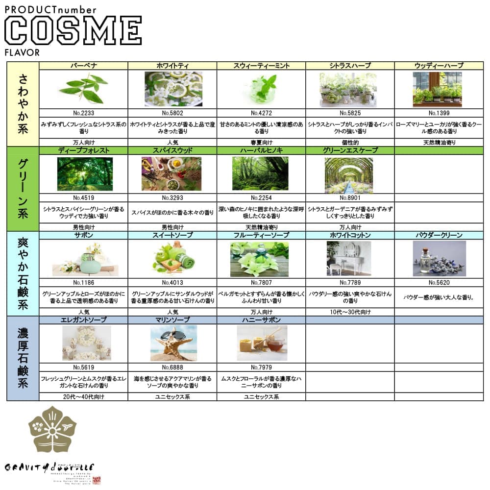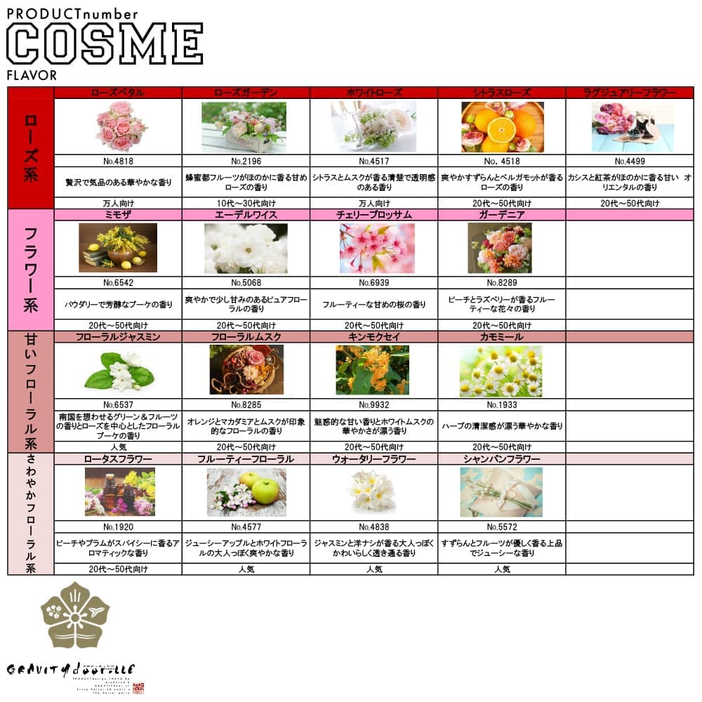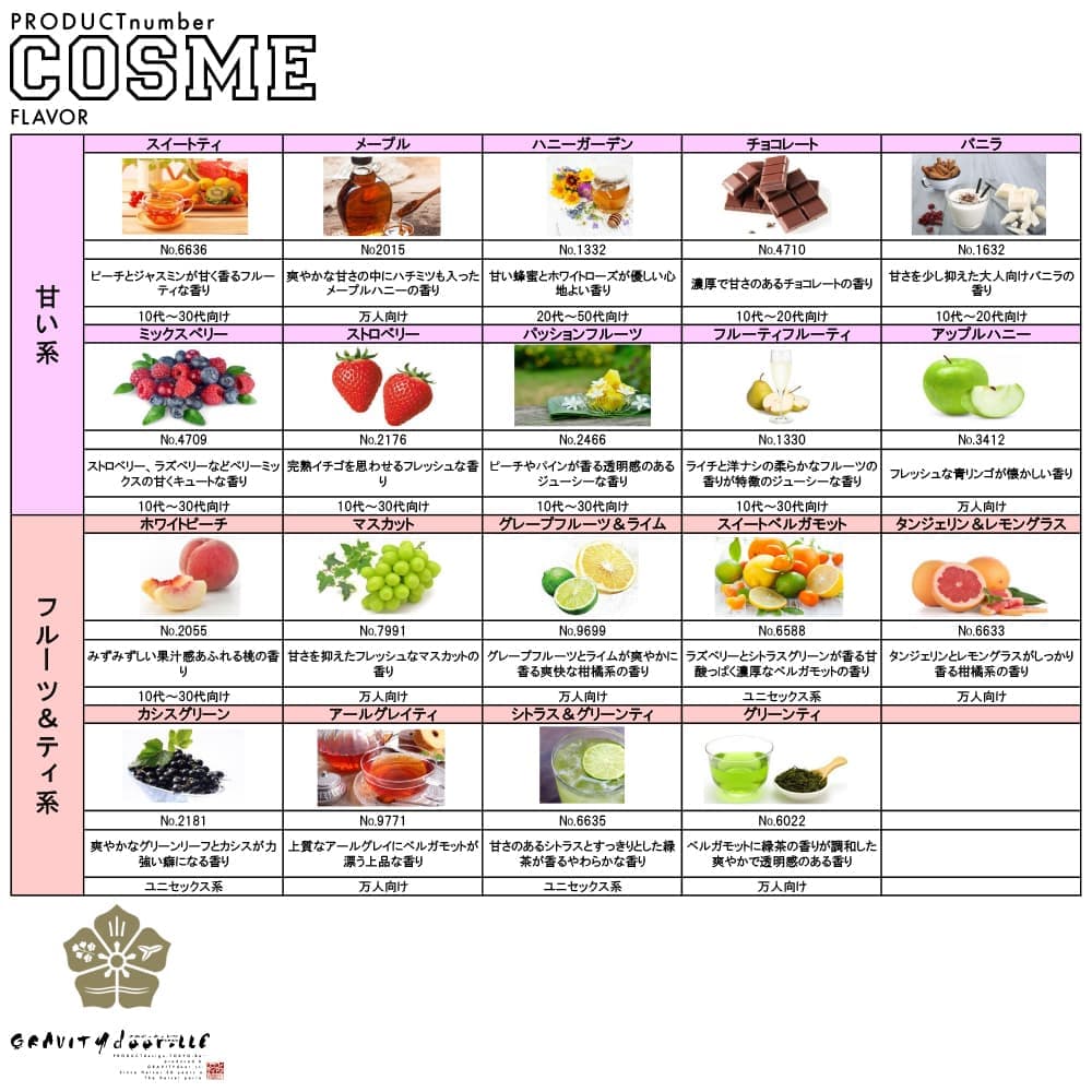 下記画像内の香料一覧から系統・香料を選択いただき、香りテスターを提出し決定いただきます。